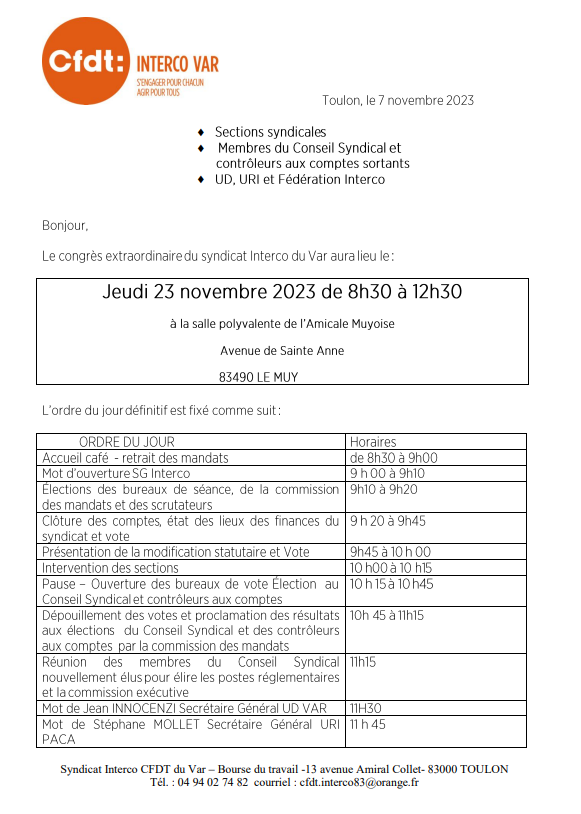 CONGRES EXTRAORDINAIRE : Jeudi 23 Novembre 2023